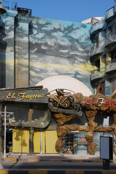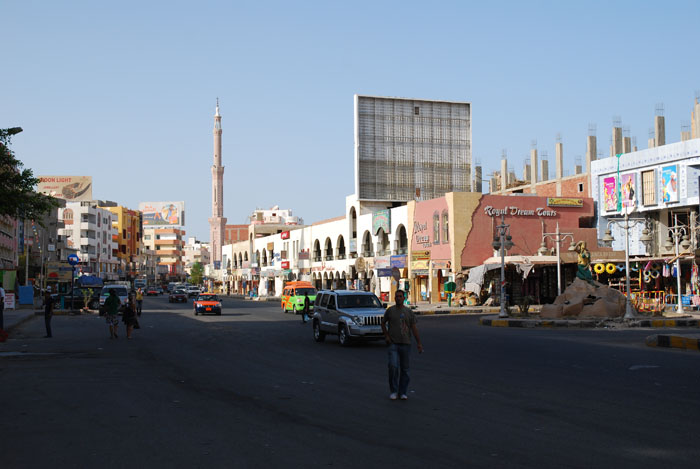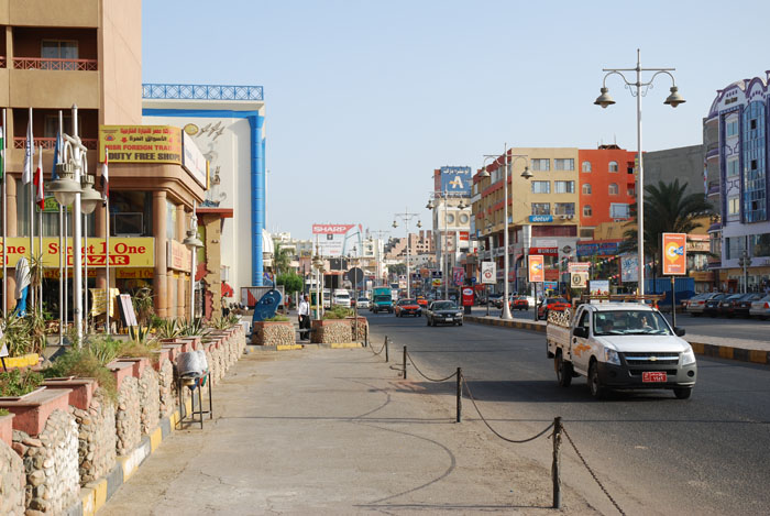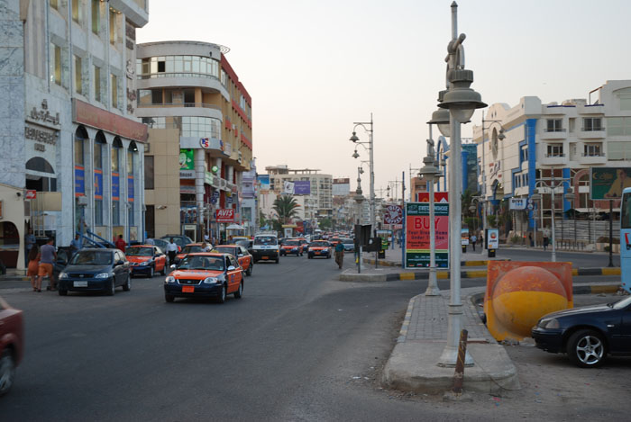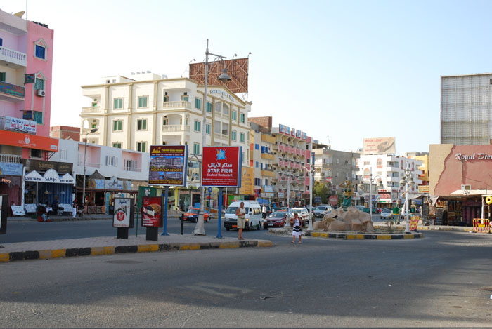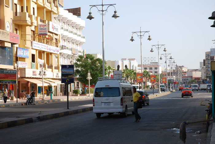 Новостройки соседствуют с горами мусора, пустые здания без окон - рядом со сверкающими отелями, ослики, тянущие повозки - рядом с новенькими Тойотами. Непрерывное движение транспорта на дороге, 70% который - это такси оранжево-синего цвета, неумолкающее бибикание клаксонов - всё это - неотъемлемая часть Хургады. Кроме малюсеньких маршруток и такси - другого транспорта просто нет!