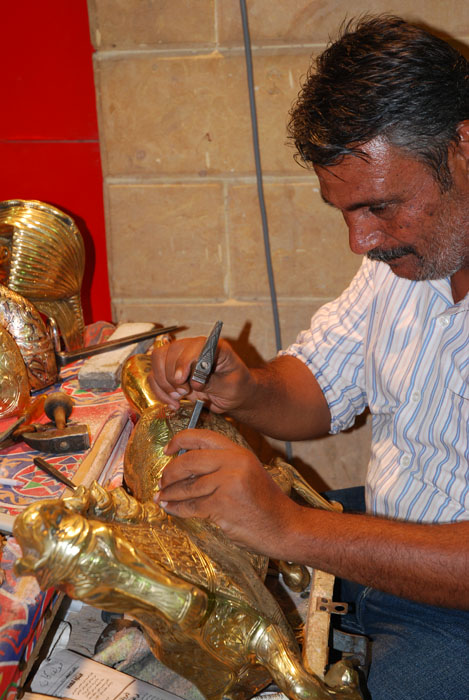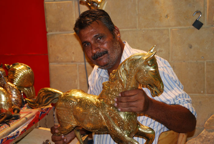 Вдоль улицы множество открытых магазинчиков и различных умельцев, которые изготавливают свои безделушки прямо на тротуарах и сразу же их продают. Вот, например, чеканщик, украшает узором медную лошадь: