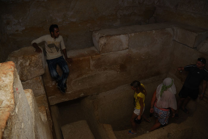 Нас впустили в «мастабу» находящуюся рядом с пирамидой Хеопса. Это своеобразная гробница высшего чиновничества. Она представляет собой небольшое возвышение над землёй с целым рядом комнат: