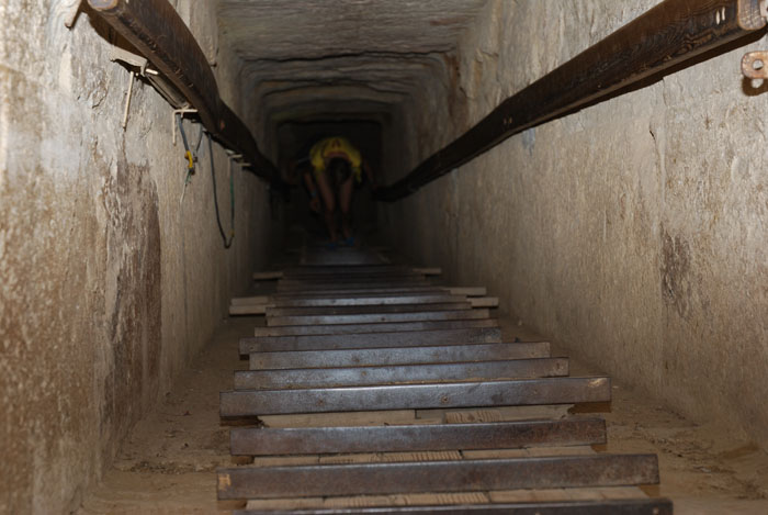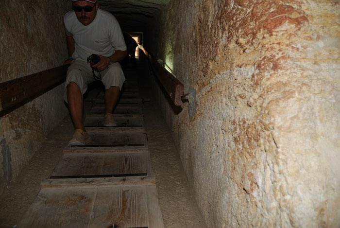 Вход в гробницу - глубокий и низкий тоннель - уходил под большим углом метров на 15..20 вниз под пирамиду: