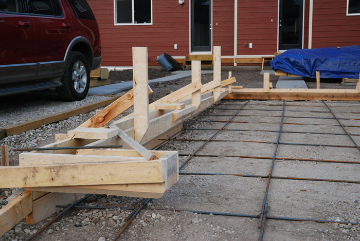 В этом случае бетоном зальют ровную площадку, потом делать вторую опалубку для бордюров и самим доливать их, заказывая уже меньшее количество бетона, арендую прицеп и бетономешалку. По моим подсчётам этот вариант получался около $2700. По времени займёт примерно 1..2 недели
