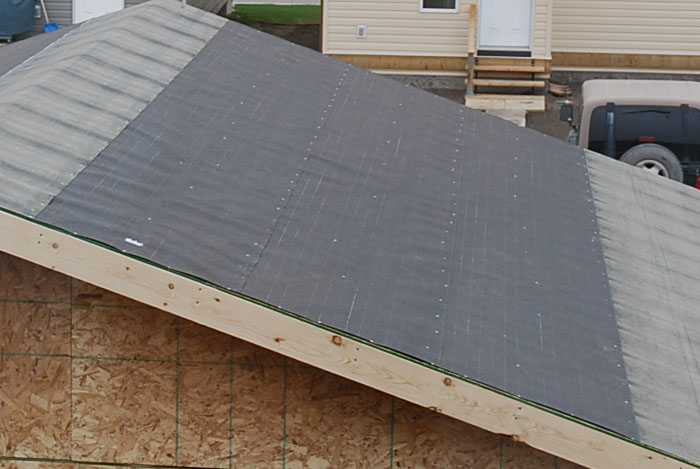 Этот день мы потратили на первый слой кровли. Причем он весьма интересный. По краям и на "коньке" применяется один тип материала, более грубый и жесткий с битумной полосой. А всё остальное простой рубероид. Правда, тоже не простой, а с нанесённой разметкой под кройки шингласом: