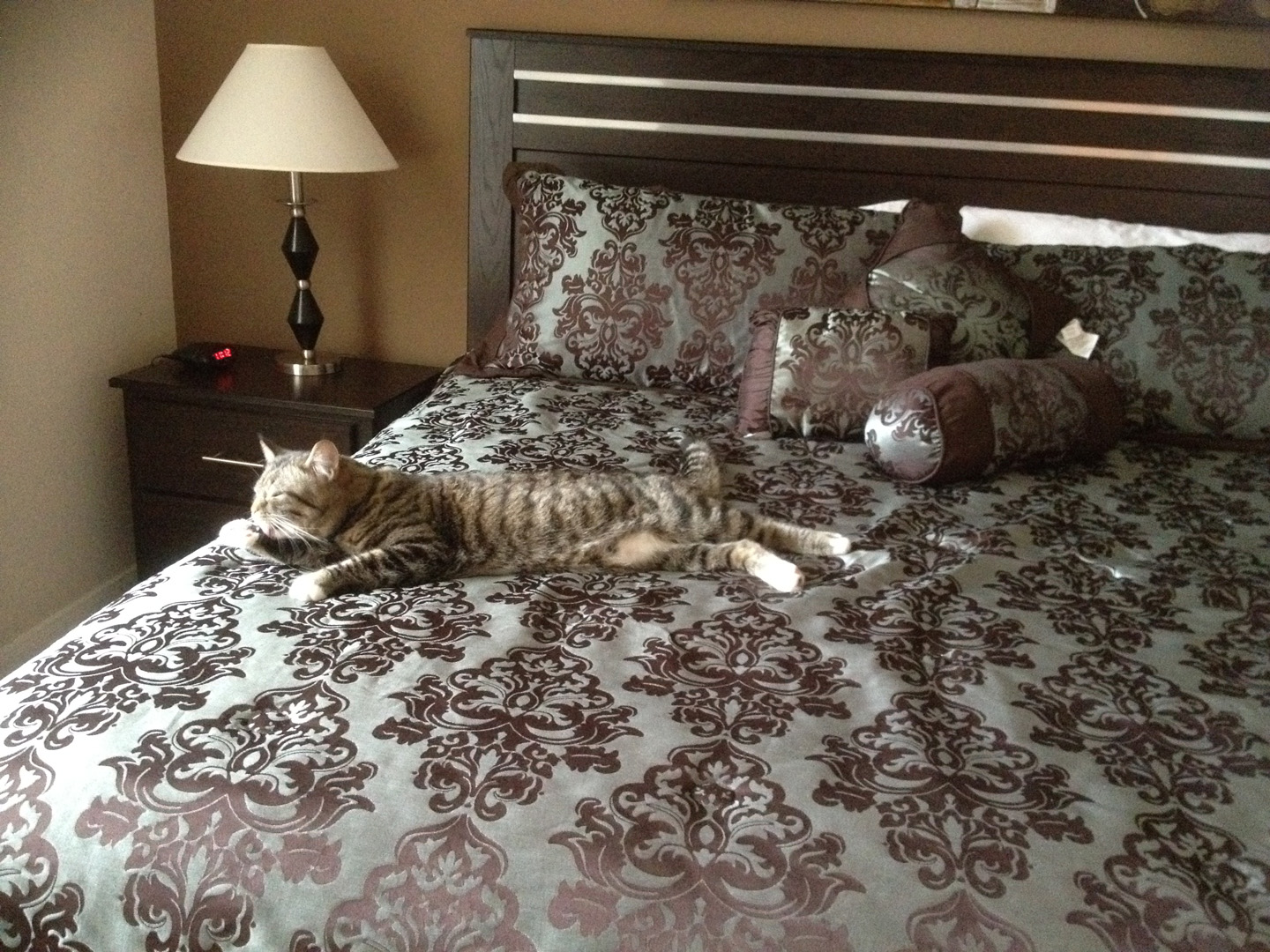 В отелях он, первым делом, всё обнюхивал, потом находил самое мягкое место (как правило центр кровати) и опять дрых всю ночь. Я вообще удивляюсь, как можно столько спать?!