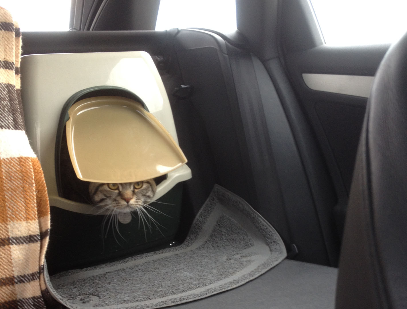 А котяра, от ужаса пересечения границы забился в туалет, который мы ему установили в багажнике, и до приезда вечером в гостиницу оттуда не вылазил...