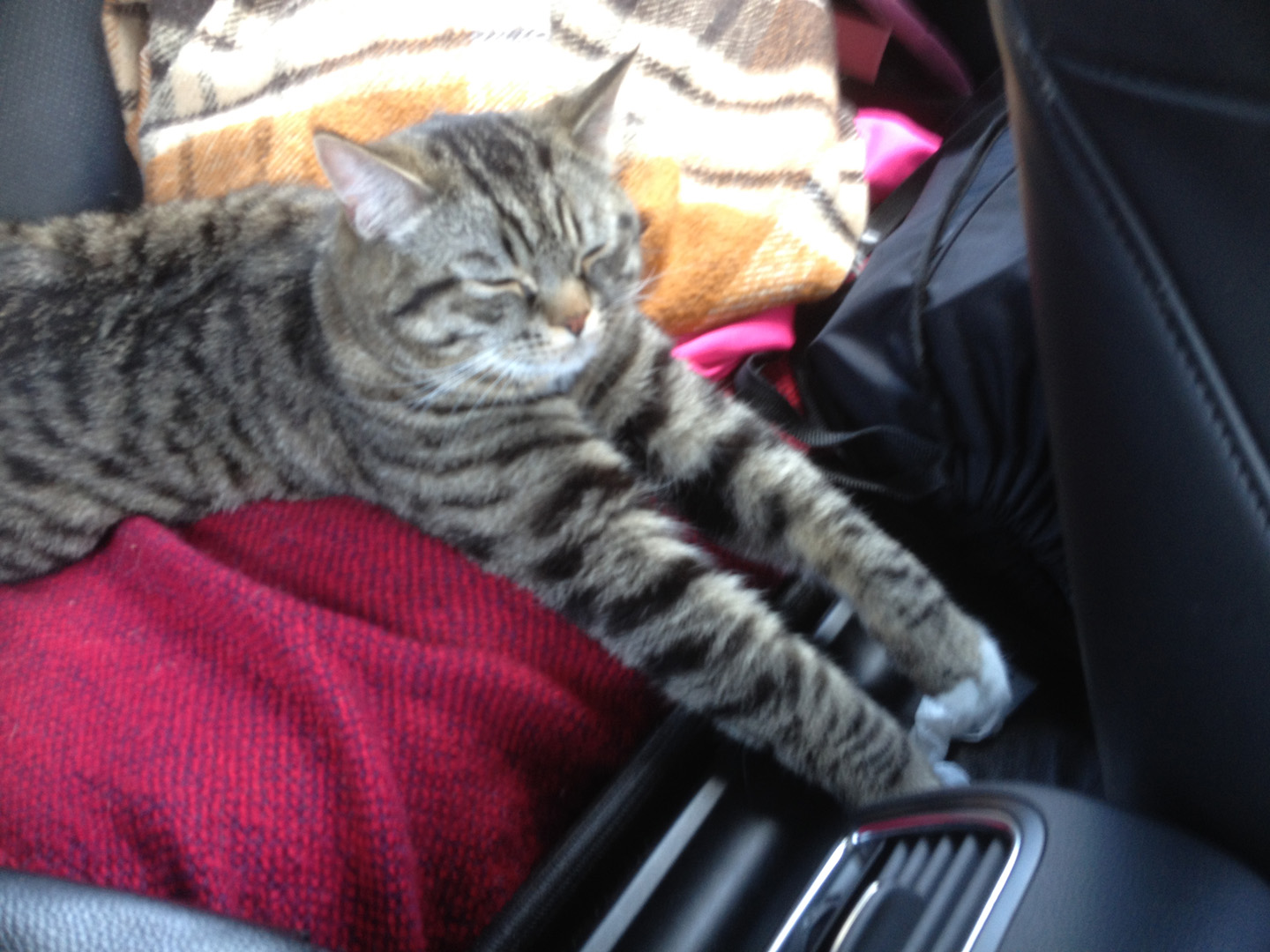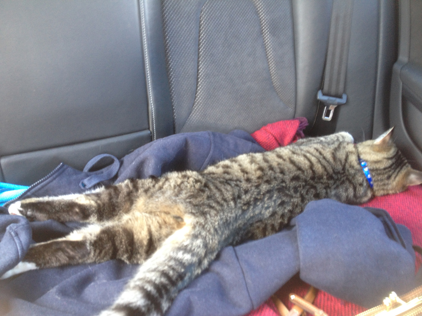 На второй день котяра осмелел, и уже ничего не боялся. Всё заднее сидение было в его распоряжении и 95% времени он спал то лапами к верху то головой к низу: