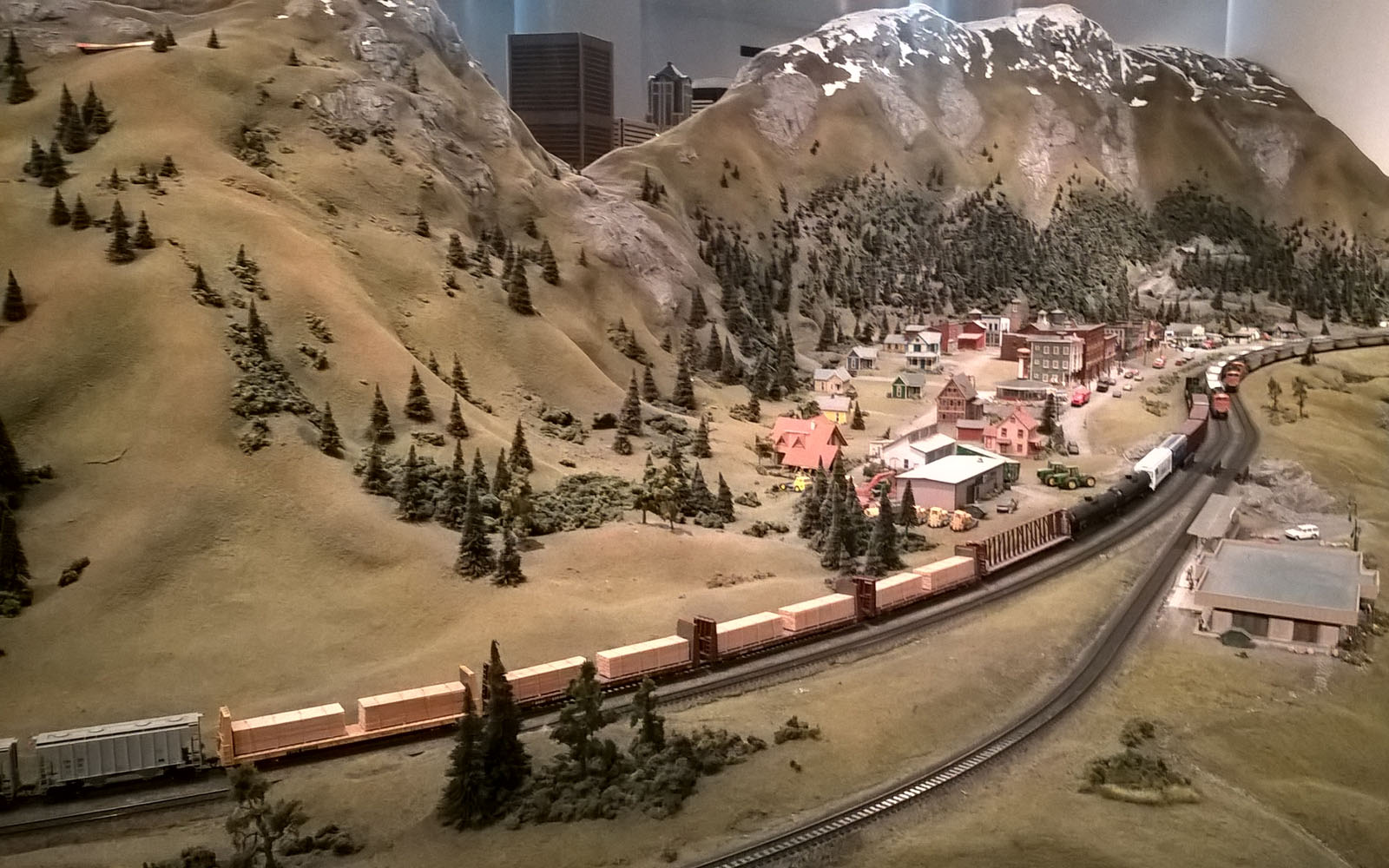 Город в миниатюрной копии с движущимися поездами и сменой дня и ночи: