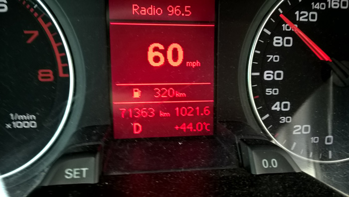 Середина августа - пик жары. Как-то ехал по хайвэю домой и мельком глянул на датчик температуры: +44. Не удержался, сделал фотку: