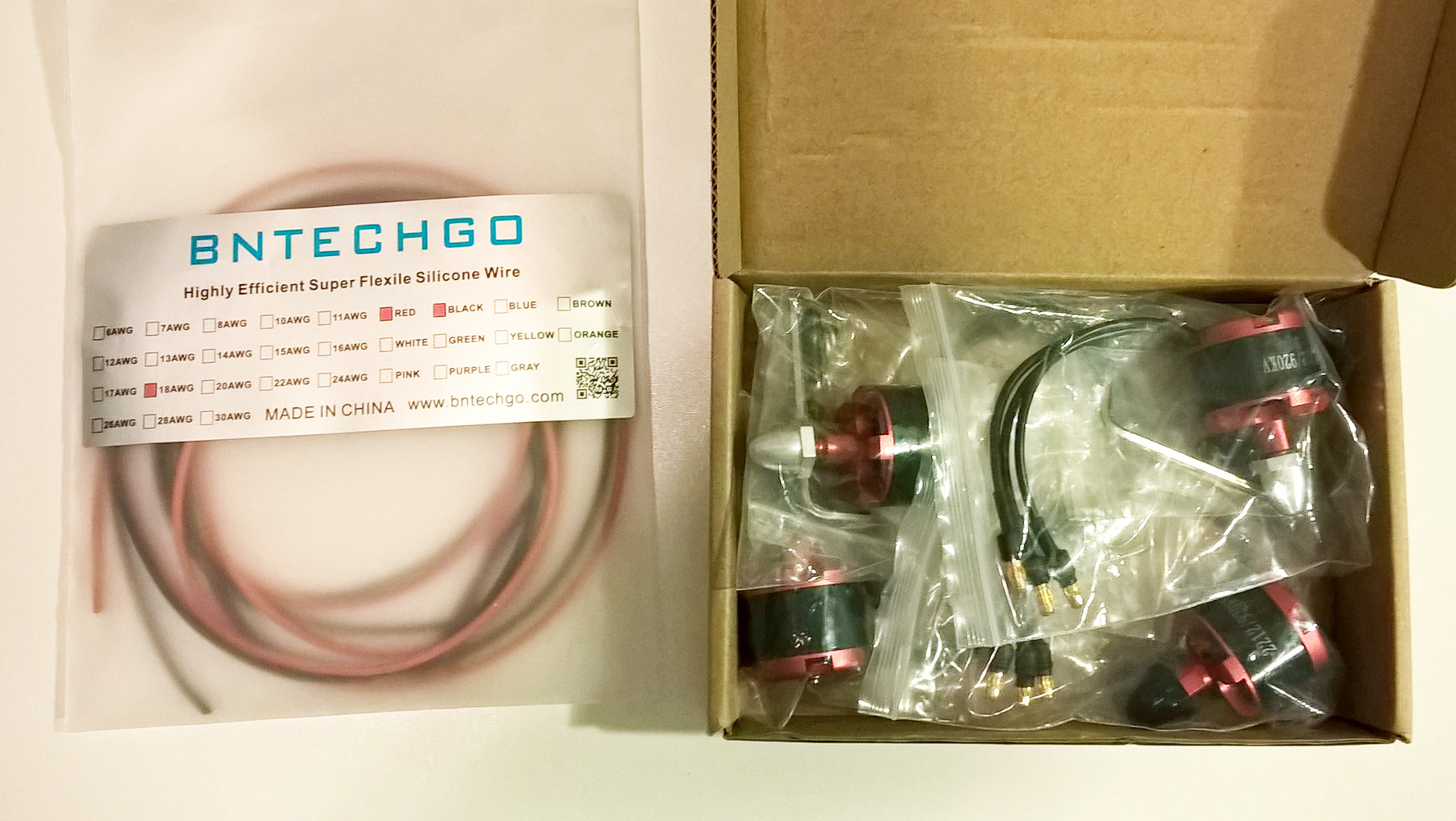 Моторы по отзывам очень не плохие и, в то же время, не дорогие. Посмотрю как они будут себя вести. Пришли аккуратненько запакованые, каждый в пакетике со всеми винтиками и готовыми к подключению разъёмами типа "bullet banana". Два правого вращения, два левого. Разница между ними только в резьбе для прикручивания винта соответствующего направления вращения. Идея такого крепления мне понравилась т.к. с точки зрения безопасности винты с гайкой будут себя постоянно поджимать (за счёт инерции), не давая открутиться и сорваться.