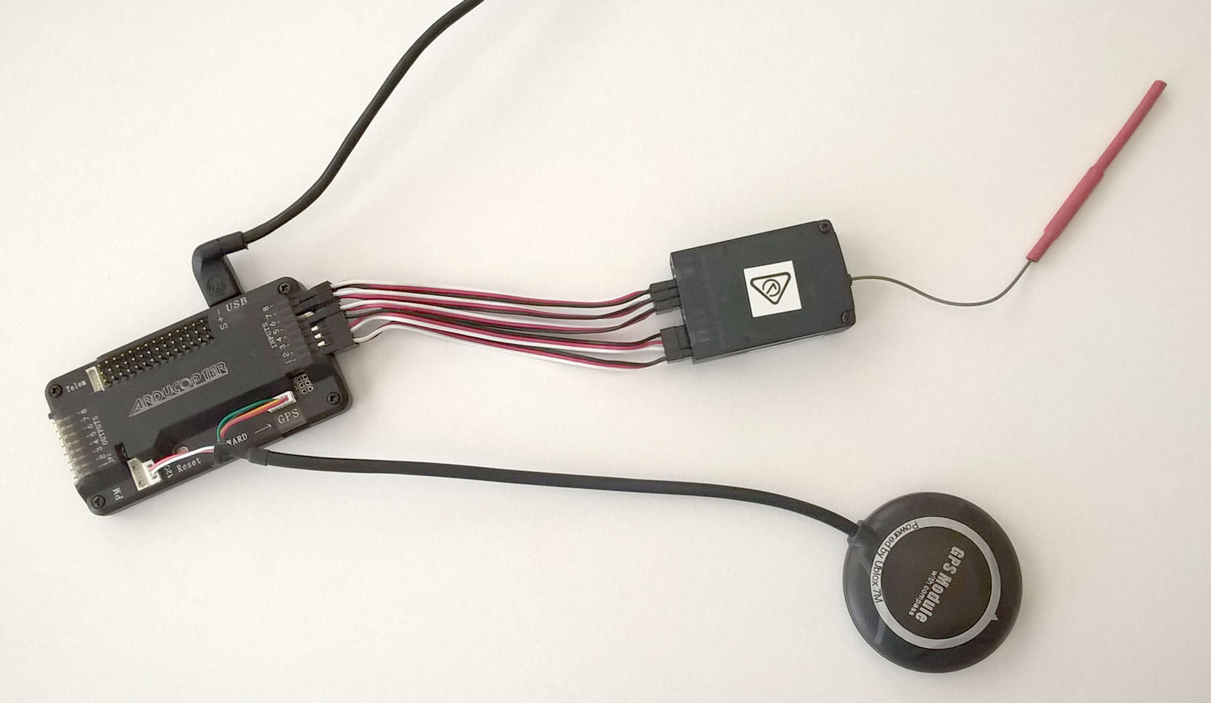 Далее, я подключил модуль GPS с компасом к контроллеру. Собственно вот так выглядит мой дрон на сегодня: